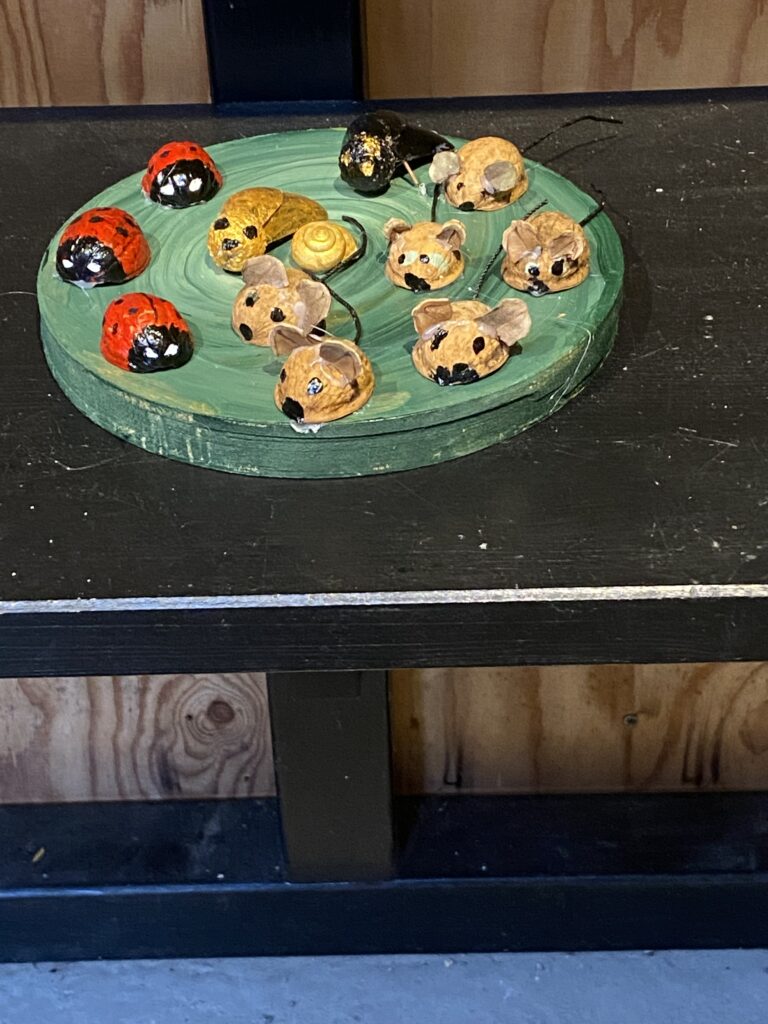 Mariehønsene er også lavet af halve valnøddeskaller, der er malet. Det er nemt og